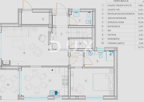 Wir präsentieren stolz das Projekt eines Neubaus in der Nähe der malerischen Stadt Tinjan. Es handelt sich um ein Projekt zum Bau eines privaten Komplexes typischer Villen, der nach dem Vorbild italienischer Villen mit einem Hauch istrischen Baustils gestaltet ist. Die Villen sind eingebettet in eine Umgebung mit herrlicher Natur, einer sanften Hügellandschaft und bewirtschafteten Ackerfeldern. Beim Bau wird eines der modernsten Materialien verwendet, was das Qualitätsniveau bestätigt und maximalen Komfort während des Aufenthalts in jeder Villa bietet. Bei der Ausstattung der Villen kommt eine der modernsten auf dem Markt erhältlichen Techniken zum Einsatz, natürlich handelt es sich dabei um namhafte globale Hersteller. Darüber hinaus legten die Investoren großen Wert auf die Gestaltung des Innenraums der Villen, um sicherzustellen, dass jeder Raum seine vorgesehene Funktion vollständig erfüllt. Alle Villen der Anlage verfügen über die gleiche Grundfläche und Raumaufteilung, lassen ihren zukünftigen Eigentümern aber selbstverständlich Raum, die Immobilie in Zusammenarbeit mit dem Investor an ihre Bedürfnisse und Wünsche anzupassen. OBJEKTBESCHREIBUNG: Diese hochwertige, malerische Villa verfügt über insgesamt 127,66 m² Wohnfläche, die auf zwei Etagen aufgeteilt ist, nämlich; Erdgeschoss (73,73 m2) und erster Stock (53,93 m2). So empfängt uns im Erdgeschoss der Villa eine Eingangshalle, die zum Wohnbereich führt, der als offener Raum ohne Trennwände konzipiert ist. Geplant ist hier ein großes und gemütliches Wohnzimmer mit Holzkamin und einer Glasschiebewand, durch die sich der Zugang und Blick auf den Garten und den Pool erstreckt. Neben dem Wohnzimmer, leicht abgetrennt, befindet sich der Raum für die Küche mit einem geräumigen Esszimmer, von dem aus auch der Ausgang zur überdachten Terrasse durch die Glaswand reicht. Neben dem Wohnzimmer gibt es auch das durch einen kleineren Flur getrennte erste Schlafzimmer, das über ein eigenes Bad und Zugang zum Garten verfügt. Darüber hinaus gibt es im Erdgeschoss der Villa in der oben genannten Lobby ein Gäste-WC sowie eine Treppe, die in die erste Etage der Villa führt, wo sich 2 komfortable und geräumige Schlafzimmer befinden. Jedes Schlafzimmer verfügt über ein eigenes Bad sowie Zugang zu einer Gemeinschaftsterrasse. Am Ende der Bauarbeiten wird der Hof vollständig begrünt und von einer Mauer umgeben sein. Somit haben Sie die Möglichkeit, Ihren Aufenthalt im Freien umgeben von zahlreichen mediterranen Pflanzen und angelegten Grünflächen zu verbringen, die durch ein automatisches Bewässerungssystem versorgt werden. Natürlich wird der zentrale Teil des Gartens von einem komfortablen Swimmingpool mit Elektrolyseanlage (Salzwasser) und einer Liegewiese eingenommen, während Sie sich keine Sorgen um Ihre Blechhaustiere machen müssen, da Parkplätze für bis zu 2 Autos vorhanden sind im Garten der Villa geplant. ZUSÄTZLICHE INFORMATIONEN: * Villen werden schlüsselfertig und ohne Möbel verkauft. * Käufer haben das Recht, Einfluss auf die Konstruktion zu nehmen. * Die Villa wird mit Klimaanlagen in jedem Raum sowie einer elektrischen Fußbodenheizung in allen Räumen ausgestattet sein. * Die Immobilie ist in das Mehrwertsteuersystem einbezogen, was bedeutet, dass für juristische Personen der Preis abzüglich des Steuerbetrags berechnet werden kann. * Das voraussichtliche Ende der Arbeiten ist Mitte 2025. Für weitere Fragen, notwendige Informationen oder den Wunsch, einen Termin zur Besichtigung der Villa zu vereinbaren, können Sie sich gerne vertrauensvoll an uns wenden. Sehr geehrte Kunden, die Agenturprovision wird gemäß den Allgemeinen Geschäftsbedingungen www.dux-nekretnine.hr/opci-uvjeti-poslovanja berechnet