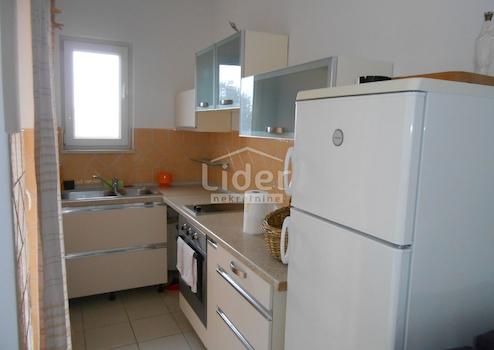 VANTAČIĆI (KRK ISLAND) 56,20 m2 Wohnung mit einem 90 m2 großen Garten und teilweise Meerblick. Diese interessante Wohnung besteht aus einer Eingangshalle, einem Badezimmer, zwei Schlafzimmern, einer voll ausgestatteten Küche, einem Wohnzimmer mit Esszimmer mit Zugang zu einer 8 m2 großen überdachten Terrasse und einem großen Garten.
