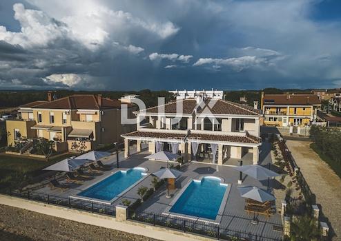 Die erste Stadt bei der Einreise nach Istrien aus dem Norden – Umag. Es besticht durch seine Vielfalt und Fülle an Angeboten. Umag ist eine kleine Stadt, die mit einer 45 km langen Küste und einem interessanten Hinterland die Besonderheiten der gesamten Region vereint und vielleicht die beste Einführung in ein anderes Erlebnis des Mittelmeers bietet. Die Stadt Umag hat eine sehr interessante Geschichte. Römische Adlige entdeckten es und beschlossen, es als ihre Sommerresidenz zu nutzen. Die Pracht, Opulenz und der Glamour jener Zeit spiegeln sich noch heute in den venezianischen Häusern des alten Stadtkerns wider – Teile der Mauern und Türme sowie Renaissance- und Barockgebäude und Kirchen sind erhalten geblieben. Nur wenige Autominuten von der Stadt Umag entfernt, nur 500 m vom Meer entfernt, befindet sich diese wunderschöne moderne Villa mit einem außergewöhnlichen Blick auf das Meer! Die Gesamtfläche der Villa beträgt 210 m2 und erstreckt sich über zwei Etagen. Im Erdgeschoss befinden sich ein Wohnzimmer mit offener Küche und Esszimmer, 2 Schlafzimmer, ein Technikraum und ein Badezimmer. Vom Wohnzimmer aus haben Sie Zugang zu einer überdachten Terrasse, von der aus Sie Zugang zu einem wunderschön angelegten Garten mit moderner Beleuchtung und Bewässerung haben, in dem sich ein Swimmingpool und eine Liegewiese befinden. Der erste Stock ist über eine interne Holztreppe erreichbar, wo sich ein Badezimmer und drei Schlafzimmer befinden, von denen zwei über ein eigenes Badezimmer und Zugang zu einer großen Terrasse mit herrlichem Blick auf das Meer verfügen. Das Haus wurde mit hochwertigen Materialien gebaut und verfügt über Fußbodenheizung und Klimaanlage in jedem Raum. Es verfügt über 3 Parkplätze. Aufgrund seiner Lage und hervorragenden Ausstattung ist dieses Haus eine ausgezeichnete Investition für diejenigen, die eine moderne Immobilie in Meeresnähe für touristische Zwecke oder als ganzjährigen Wohnsitz suchen. Das Stadtzentrum von Umag, das Meer und schöne Strände, verschiedene Qualitätsrestaurants, Cafés, Promenaden, Radwege, Geschäfte und verschiedene andere notwendige Einrichtungen sind nur 5 Autominuten entfernt. Sehr geehrte Kunden, die Agenturprovision wird gemäß den Allgemeinen Geschäftsbedingungen berechnet: www.dux-nekretnine.hr/opci-uvjeti-poslovanja