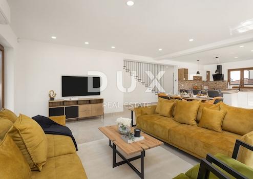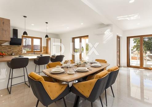 ISTRIEN, KAVRAN - Doppelhaushälfte mit Pool - MEERBLICK!! Auf einem insgesamt 374 m2 großen Grundstück wurde dieses schöne zweistöckige Haus gebaut. Hausgröße: 235 m2 brutto; 171 m2 Netto; Dieses Anwesen liegt an einem ruhigen Ort, umgeben von Natur, nur 1,5 km von schönen Stränden entfernt. Das Haus wurde im Jahr 2022 gebaut. Es erstreckt sich über zwei Etagen. Im Erdgeschoss gibt es ein Badezimmer, ein großes Wohnzimmer mit Küche und ein Esszimmer (offener Raum) mit Zugang zu einer überdachten Sommerküche mit Grill, einer Sonnenterrasse und einem 24 m² großen Swimmingpool. Eine Innentreppe führt uns in die 1. Etage, wo sich 3 Schlafzimmer mit jeweils eigenem Bad befinden. Das Hauptschlafzimmer verfügt über einen Balkon mit herrlichem Blick auf das Meer. Das Haus wird wie auf den Bildern gezeigt möbliert verkauft. Jedes Zimmer ist klimatisiert, verfügt über einen Heizraum, Kamin im Wohnzimmer, hochwertige Holzschreinerei, Klärgrube, Alarmanlage und Videoüberwachung, Energieausweis A+. 3 Parkplätze vor dem Haus. Das Haus eignet sich perfekt für den Urlaub, aber auch zum ganzjährigen Wohnen. Klares Eigentum 1/1, keine Belastungen – GELEGENHEIT!! Sehr geehrte Kunden, die Agenturprovision wird gemäß den Allgemeinen Geschäftsbedingungen berechnet: www.dux-nekretnine.hr/opci-uvjeti-poslovanja