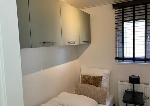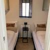 Geräumiges Schlafzimmer mit 2 Einzelbetten mit Flügelfenster mit moskitonetz und viel Stauraumen auf beiden Seiten