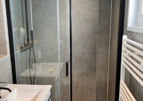 Badezimmer mit Geräumige Duche, Waschbecke und wc