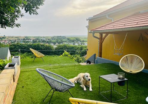 Az udvar tiszta és rendezett. Az előkertben gyümölcsfák, a hátsó udvarrészben szőlőtőkék találhatóak.