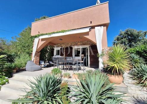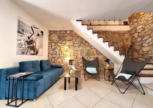 Das Haus mit einer Fläche von 115 m2 erstreckt sich über das Erdgeschoss und den ersten Stock. Im Erdgeschoss gibt es ein Wohnzimmer mit Esszimmer und Küche, ein Badezimmer und eine große überdachte Terrasse, die mit einem angelegten Garten verbunden ist. Eine Innentreppe führt in den ersten Stock, wo sich zwei Schlafzimmer und ein großes Badezimmer mit Badewanne befinden. Das Schlafzimmer und das Badezimmer haben Zugang zur Terrasse mit Blick ins Grüne. Bei der Renovierung wurden hochwertige Materialien verwendet. Im Garten gibt es einen Swimmingpool mit Sonnendeck, einen Kamin und einen Abstellraum. Der Garten verfügt über ein Bewässerungssystem und ist im mediterranen Stil gestaltet. Am Eingang des Hofes gibt es Parkplätze für zwei Fahrzeuge und einen überdachten Bereich für Fahrräder.