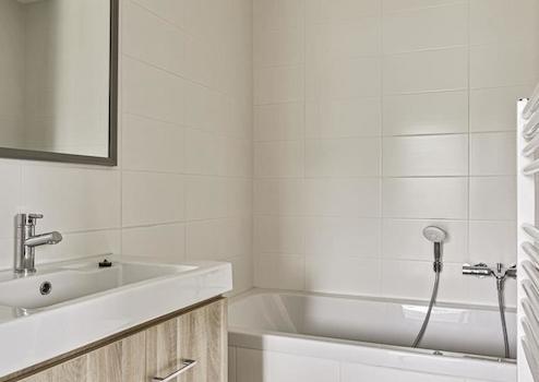 Dieses Badezimmer ist offen mit dem ersten Schlafzimmer verbunden und verfügt über eine schöne Badewanne zum Entspannen und ein Waschbecken mit einem schönen Schrank in einer warmen Holzfarbe.