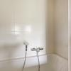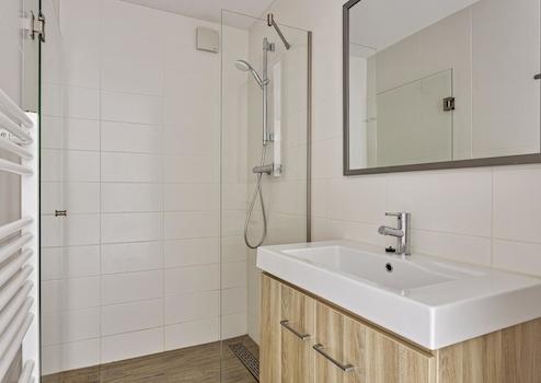 Das zweite Badezimmer ist mit dem zweiten Schlafzimmer verbunden. Hier gibt es eine begehbare Dusche und auch ein Waschbecken mit einem Schrank in einer warmen Holzfarbe.