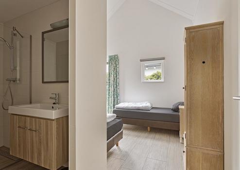 Dieses Schlafzimmer hat zwei getrennte Boxspringbetten und einen Kleiderschrank, in dem Sie Ihre Sachen aufbewahren können. Dieses Schlafzimmer hat auch ein eigenes Bad.