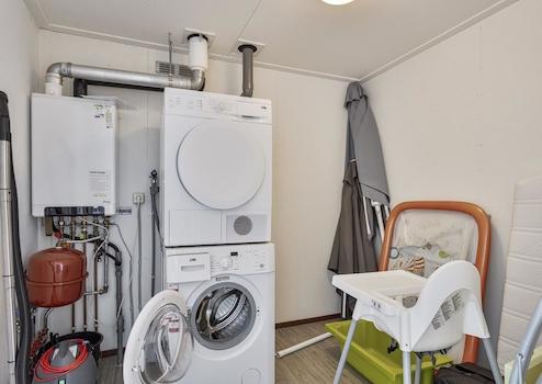 Die Küche ist übersichtlich, aber komplett ausgestattet. Ein 4-Flammen-Gasherd, eine Kombimikrowelle, ein Kühlschrank mit Gefrierfach und ein Geschirrspüler. Alle Geräte sind eingebaut.