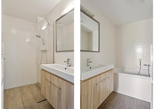 Das erste Badezimmer gehört zu Schlafzimmer 1. Hier finden wir einen schönen Waschbeckenschrank in einer warmen Holzfarbe und wenn Sie sich eine Weile entspannen wollen, können Sie dies in der der Badewanne machen.
