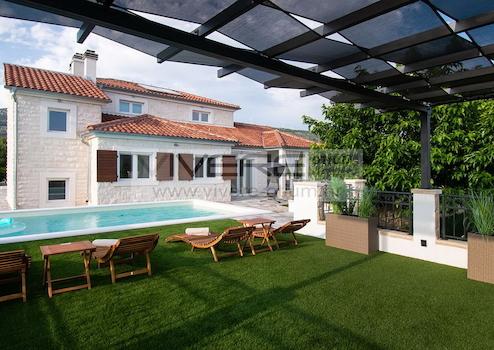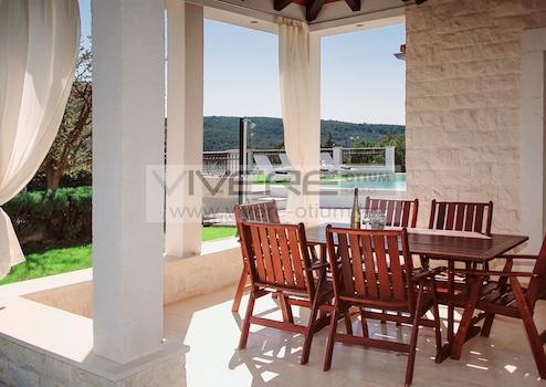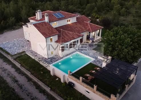 Die Villa hat sowohl eine moderne Note mit ihrer feinst gewählten Einrichtung als auch eine gewisse rustikale Atmosphäre, die von Steindetails geprägt wird, zu bieten. Die Wohnfläche erstreckt sich über zwei Etagen. Eine voll ausgestattete, elegante Küche mit Essbereich, ein helles, durchdachtes und komfortables Wohnzimmer mit Kamin verströmen Großzügigkeit und das hochwertige Interieur garantiert kompletten Komfort. Das Anwesen bietet seinen zukünftigen Eigentümern Unterhaltungsmöglichkeiten im Erdgeschoss auf einer Fläche von 30 m², wo sich Billard und Darts befinden, sowie eine zusätzliche kleine Küche mit großem Einbaugrill. Desweiteren finden Sie im Erdgeschoß ein en-suite Schlafzimmer und ein Gäste-WC vor. Eine Innentreppe führt ins erste Obergeschoß mit zwei geräumigen Schlafzimmern, eines mit Zugang zu einer privaten Terrasse, ein großes Badezimmer mit Badewanne und eine Waschküche. Das gesamte Anwesen ist klimatisiert und mit Zentralheizung sowie Fußbodenheizung im Erdgeschoss ausgestattet. Das Äußere der Villa besteht aus einer überdachten Terrasse mit einer schönen Aussicht auf die Umgebung und einem 28 m² großen beheizbaren Pool, der von Sonnenliegen umgeben ist. Es gibt auch einen Außengrill, wo Sie frische Mahlzeiten für ihre Familie und Freunde vorbereiten können, während Sie die Aussicht und die schöne mediterrane Natur genießen. Der wunderschöne Garten ist mit einem Bewässerungssystem ausgestattet. Unterhalb des Pools befindet sich ein Keller von 60 m², in dem sich die Heizungsanlage befindet. Ein privater Parkplatz für bis zu 5 Fahrzeuge runden das Angebot ab.