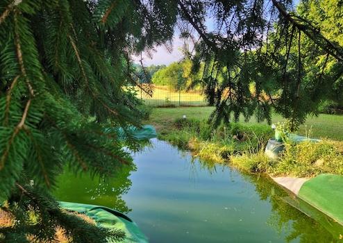 A melléképület folytatása után található a dísztó, egy parkosított, nagy udvarrésszel, amely kerítéssel van elszeparálva a hátsó birtokrésztől.