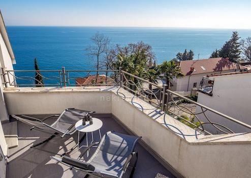 Zum Verkauf steht ein luxuriös ausgestattetes Penthouse, das sich über zwei Etagen mit 202 m2 erstreckt. Es gibt eine zweite Reihe zum Meer. Es hat einen herrlichen Blick auf die Kvarner Bucht und einen sehr schön angelegten Gartenbereich, umgeben von gepflegtem Grün, einem Whirlpool, einem Sonnendeck und einer Sommerküche. Es besteht aus einer Eingangshalle, einer Toilette, einem Abstellraum, zwei Schlafzimmern, einem Kleiderschrank, zwei Badezimmern, einem Wohnzimmer, einer Küche und einem Esszimmer, zwei Loggien und einem Balkon mit einer Gesamtfläche von 135,32 m2, einschließlich eines überdachten Eingangs ein sekundärer Teil, ein Nebengebäude und eine nicht überdachte Terrasse im 2. Stock mit einer Gesamtfläche von 28,74 m2 und Arbeitszimmer, Badezimmer, Zimmer und nicht überdachte Terrassen auf der Galerie mit einer Gesamtfläche von 58,14 m2, eine Gesamtfläche von die Wohnung und Zubehör 222,20 m2. Es gibt einen Parkplatz vor dem Haus. Ein tolles Anwesen in einer fantastischen Lage.
