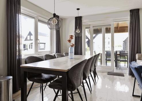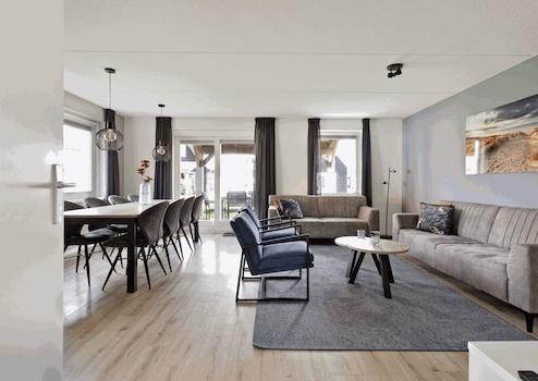 Geräumiges Wohnzimmer mit einer Schiebetür zur Terrasse, die von einer Veranda überdacht ist, so dass Sie bald draußen sitzen können. Im Wohnzimmer befindet sich auch die offene Eckküche. Sitzen Sie zusammen auf einem der Sofas oder in einem Sessel, essen Sie zusammen am großen Esstisch mit 8 Stühlen, es ist alles möglich.