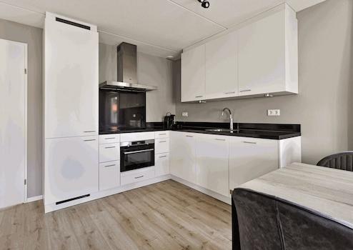Die schöne Eckküche ist in einem matten Weiß gehalten, was ihr ein ruhiges Aussehen verleiht. Diese Küche hat eine Dunstabzugshaube, Induktionskochfeld, Geschirrspüler, Kühl-Gefrierkombination und Mikrowelle.