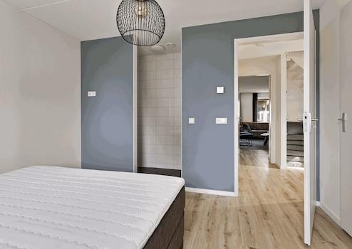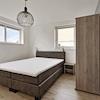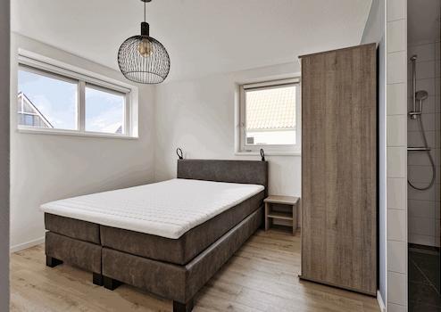Geräumiges Schlafzimmer im Erdgeschoss mit, ja, einem eigenen Bad. Der Kleiderschrank ist da, um Ihre Sachen zu verstauen und hier finden wir auch die Waschmaschine ordentlich hinter einer Tür versteckt.