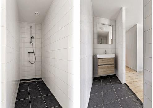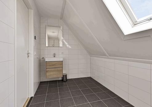 Im Obergeschoss zwischen den beiden Schlafzimmern finden wir das dritte Badezimmer. Waschbecken mit Schrank in einer schönen warmen Holzfarbe und eine begehbare Dusche. Im Dach wurde ein Oberlicht installiert.