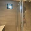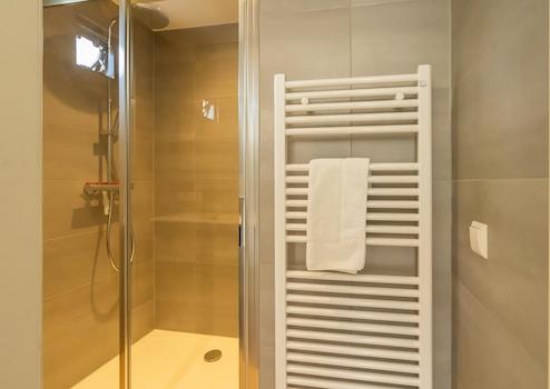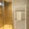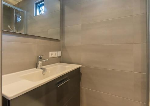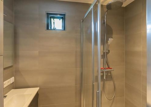 Das Badezimmer hat eine Dusche und ein Waschbecken. Die Toilette ist separat.