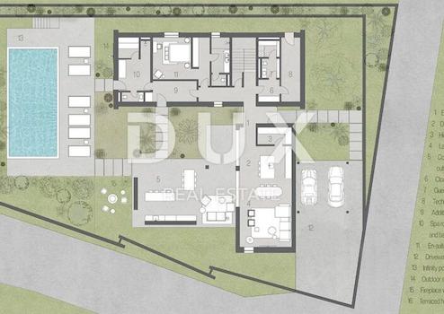 Wir präsentieren stolz ein neues Projekt exklusiver Villen, die auf ihre ganz besondere Weise moderne Eleganz und mediterrane Tradition verbinden und eine einzigartige Gelegenheit für einen exklusiven Lebensstil schaffen in einer malerischen kleinen Siedlung in der Nähe von Svetvinčenat, die aufgrund ihrer wunderschönen Landschaften, ihres kulturellen Reichtums und ihrer unglaublichen Gastronomie als „kleine Toskana“ bekannt ist. Es handelt sich um ein luxuriöses Projekt mit vier Villen, die nicht nur Zuflucht vor der Hektik des modernen Lebens bieten, sondern auch einen unglaublichen Beweis für architektonische Lösungen darstellen. Mit bequemem Zugang zu den historischen Städten Istriens sowie kristallklaren Stränden versprechen diese Villen einen Lebensstil von unvergleichlicher Eleganz und Ruhe. Diese Villen wurden mit viel Liebe zum Detail und mit dem Ziel eines hohen Maßes an Eleganz und einer hervorragenden Verbindung zu Raum und Natur entworfen und stellen die ideale Lösung für alle dar, die auf der Suche nach dem „Wow“-Faktor und der Einzigartigkeit sind. Dabei handelt es sich um Villen, die nur 20 Minuten von der malerischen Stadt Rovinj, 30 Minuten vom Flughafen Pula und eine kurze Autofahrt von der sehenswerten Stadt Opatija entfernt sind. Nutzen Sie diese unglaubliche Gelegenheit und erleben Sie ein einzigartiges Erlebnis. Es ist sehr gut möglich, dass Ihre Suche nach der idealen Immobilie dort endet. OBJEKTBESCHREIBUNG: Von der sorgfältig durchdachten Dekoration, die im Einklang mit dem Raum und der Natur steht, bis hin zur erstklassigen intelligenten Technologieausstattung, die die Messlatte für Sicherheit und Praktikabilität zu Hause höher legt, wurde jedes Detail sorgfältig geplant, um ein unvergleichliches Wohnerlebnis zu gewährleisten hohes Maß an Komfort und Luxus. Die Villa verfügt über insgesamt 300 m2 Wohnfläche und bietet einen luxuriösen Wohnraum, der jeden Besucher sprachlos macht. Die Gesamtfläche der Villa ist in zwei Etagen aufgeteilt, Erdgeschoss + erster Stock. Beim Betreten der Villa werden wir zunächst von einem Vorraum mit Platz für einen Kleiderschrank begrüßt, der dann in einen Flur übergeht und den Raum im Erdgeschoss in zwei Teile teilt, ein privates Schlafzimmer und einen Teil für das tägliche Leben. Der für den Alltag vorgesehene Teil ist nach dem „Open Space“-Raumsystem ohne Trennwände gestaltet, wo Sie die Möglichkeit haben, Ihren Aufenthalt in einer komfortablen modernen Küche mit Kochinsel und anschließend in einem geräumigen Esszimmer zu verbringen, das für die ganze Familie ausreicht sowie ein geräumiges Wohnzimmer mit Kamin. Was den Aufenthalt in diesem Teil der Villa besonders macht, sind die Glaswände, mit deren Hilfe sich der Raum zum überdachten Außenbereich der Villa von insgesamt 100 m2 öffnet, komplett mit großzügigen Terrassen von 80 m2, einem großen Swimmingpool und angelegte Gärten mit Lavendel, Olivenbäumen und aromatischen Büschen, die einen Zufluchtsort für die Sinne schaffen. Der privatere Teil des Erdgeschosses besteht aus einem Schlafzimmer mit eigenem Bad, dann einem SPA-Bereich mit Sauna und Bad, von dem aus man einen herrlichen Blick auf die Natur und einen angelegten Garten hat. In diesem Teil des Erdgeschosses gibt es auch eine Gästetoilette, einen Technikraum und eine moderne Treppe, die in die erste Etage der Villa führt. Die erste Etage besteht aus drei komfortablen Schlafzimmern mit eigenem Bad, die durch einen geräumigen Flur verbunden sind. Jedes Schlafzimmer misst zusammen mit seinen Badezimmern 30 m2. Hohe Decken und Dachschrägen in den Zimmern schaffen mit natürlichem Licht in den Morgenstunden eine besondere Atmosphäre und verleihen dem Raum ein Gefühl von Ruhe und Luxus. Jedes Schlafzimmer verfügt außerdem über einen eigenen begehbaren Kleiderschrank sowie einen Schreibtisch oder Boudoirspiegel und eine Couch, die sich ideal zum Lesen und Entspannen eignet. Jedes der Badezimmer verfügt über eine ebenerdige Dusche, Doppelwaschbecken für Sie und Ihn, eingebaute Spiegel und separate Toiletten mit Stauraum. Jedes Badezimmer ist über die gesamte Höhe mit Glas mit einer transparenten Folie ausgestattet, die ausreichend Tageslicht in das Badezimmer bringt und dennoch vor Blicken von außen verborgen bleibt. Einfach ausgedrückt sind die Villen so konzipiert, dass sie ihren Besitzern ein hohes Maß an Komfort, maximale Privatsphäre und ein beneidenswertes Maß an Luxus bieten, und das alles bei einem hohen Standard an Lebensqualität und Sicherheit. GELÄNDEBESCHREIBUNG: Gönnen Sie sich eine Chance und genießen Sie die Sonne Istriens mit geräumigen Wohnbereichen im Freien, darunter Terrassenlandschaften mit Lavendel- und Olivenbäumen, einem großen Swimmingpool und einer Liegewiese, alle mit schöner Aussicht und einer engen Verbindung zur Natur. Die Villa befindet sich auf einem Grundstück von 1196 m² und verfügt über eine sorgfältig durchdachte Anordnung, die die Villa mit dem Raum und der Natur, die sie umgibt, verbindet. Besonderes Augenmerk wurde auf den Außenbereich gelegt, so dass jede der Terrassen eine Südwestausrichtung mit Blick auf das Tal und das Dorf und gleichzeitig einen Blick auf das Meer mit Sonnenuntergang hat. Die Hauptterrasse im Garten der Villa ist direkt vom Wohnzimmer aus zugänglich, wodurch ein perfekter Zusammenhalt von Außen- und Innenleben erreicht wird. Während Sie sich im SPA-Bereich der Villa ausruhen und entspannen, haben Sie auch die Möglichkeit, einen Schritt in Richtung Garten und Poolbereich zu machen. Der Wohnbereich im Freien ist vollständig überdacht, sodass Sie ihn bei jedem Wetter nutzen können. Es umfasst einen Bereich zum Sitzen und Unterhalten, ein Esszimmer und eine Außenküche mit eingebautem Grill und einer Kücheninsel, ideal zum Verbringen von Zeit mit Freunden und der Familie. Den äußersten Teil des Gartens nimmt ein großzügiger beheizter Pool mit Salzwasseranlage (El