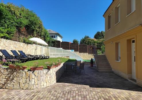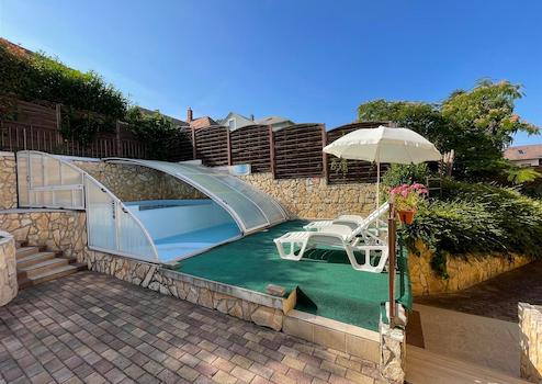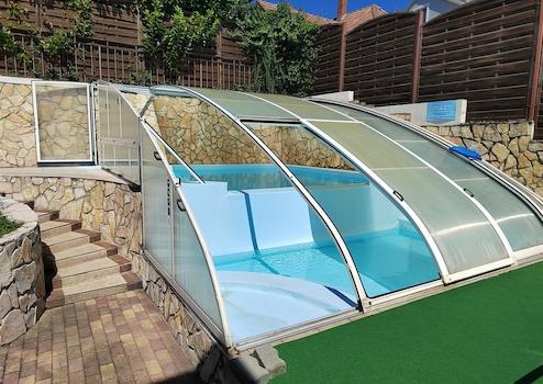 Az udvaron szabadtéri medence található napozóágyakkal. A medence méretei: 6,3 méter * 4,6 méter (mélység 60 cm és 135 cm).