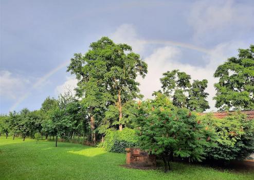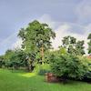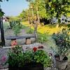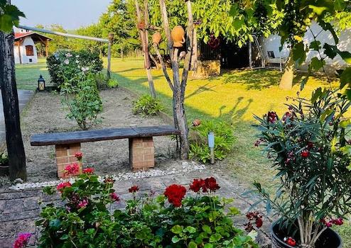 A kertben számos gyümölcsfa, virág és növény, tetővel ellátott, nyitott fészer található.