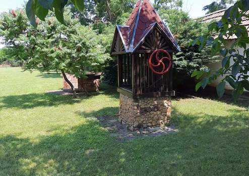 Ezek mellett külön kialakított tűzrakó rész, bográcsozáshoz, grillezéshez kiépített sütő - és főzőhely, egy szép, működő kerekes kút, illetve a kert kivételes szépségét és egyediségét, egy használható, aktív, tetővel védett, apácarácsos búbos kemence is ékesíti.