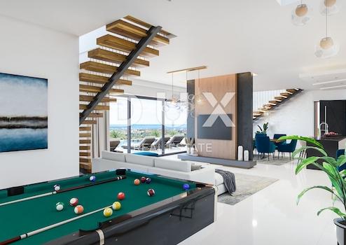 Der Infinity-Pool ist das Herzstück dieser modernen Villa und erzeugt die Illusion, dass das Wasser mit dem Himmel oder dem Meer in der Ferne verschmilzt. Eine der Poolwände besteht aus transparentem Glas, was einen einzigartigen visuellen Effekt erzeugt. Direkt neben dem Pool, nur durch transparentes Glas abgetrennt, befindet sich eine Feuerstelle – ein weiteres bezauberndes Element, das das Ambiente der Villa perfekt abrundet. Die auf Poolebene gelegene Feuerstelle spendet Wärme und schafft eine romantische Atmosphäre, den idealen Ort zum Entspannen und Beisammensein. Abends spiegelt sich das Flammenspiel in der Glaswand des Pools und erzeugt ein faszinierendes Lichtspektakel. Für ein rundum gelungenes Erlebnis können zukünftige Eigentümer in der eleganten Sauna unter Sternenhimmel entspannen oder den berauschenden Whirlpool im Freien genießen.