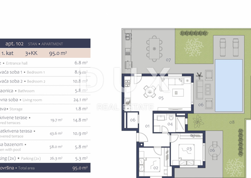 Wir präsentieren stolz dieses exklusive Projekt eines neuen Gebäudes, das nur aus sechs Luxusapartments besteht, die sich auf drei Etagen des Gebäudes verteilen. Dabei handelt es sich eigentlich um Apartments, die nur 500 Meter vom berühmten Naturpark Kap Kamenjak entfernt liegen, was auch bedeutet, dass die Apartments auch in der Nähe unvermeidlicher Naturstrände liegen, ideal zum Entspannen und Spaß mit Freunden und der Familie. Was dieses Gebäude von anderen am gleichen Standort unterscheidet, ist die äußerst hochwertige Bauweise und die hochwertigen Materialien, die beim Bau und der Ausstattung der Wohnungen verwendet wurden. Darüber hinaus unterscheidet sich dieses Gebäude von den anderen durch den Wohnkomfort in den Wohnungen, da alle für den Alltag notwendigen Inhalte leicht zu erreichen sind. BESCHREIBUNG DER WOHNUNG: Wir präsentieren eine Wohnung im Erdgeschoss des genannten Gebäudes. Es handelt sich um eine Wohnung mit insgesamt 95 m2 Wohnfläche, in der jeder Quadratmeter optimal genutzt wird, wobei der Schwerpunkt auf einem hohen Maß an Komfort liegt und in der jeder Raum seine vorgesehene Funktion voll und ganz erfüllt. Somit besteht diese Wohnung aus einem Eingangsbereich mit Platz für eine Garderobe, der den Raum der Wohnung in zwei Teile teilt, nämlich ein privates Schlafzimmer und einen Teil für den täglichen Gebrauch. Der für das tägliche Leben vorgesehene Teil der Wohnung ist nach dem „Open Space“-Raumsystem ohne Trennwände gestaltet und verfügt dort auch über ein gemütliches Wohnzimmer mit Zugang zu einer überdachten Terrasse im Hof von 19,70 m2 eine Küche mit Esszimmer, die für die ganze Familie ausreicht. Im privateren Teil der Wohnung befinden sich ein geräumiges Badezimmer, ein Abstellraum und zwei komfortable Schlafzimmer. Die Wohnung verfügt außerdem über einen eigenen privaten Garten von 58 m2, auf dem sich auch eine unverbaubare Terrasse von 43,60 m2 befindet, sowie einen privaten Swimmingpool, der ausschließlich dieser Wohnung gehört, sowie eine Sommerküche. Zur Wohnung gehören außerdem zwei markierte Parkplätze im Innenhof des Gebäudes, die im Wohnungspreis inbegriffen sind. ZUSÄTZLICHE INFORMATIONEN: * Die Wohnung wird ohne Möbel verkauft. * Die Immobilie ist ordentlich. * Käufer müssen keine Immobilienumsatzsteuer in Höhe von 3 % zahlen. * Die Wohnungen werden mit Fußbodenheizung in allen Räumen der Wohnung verkauft. * Im Lieferumfang sind 3 Inverter-Klimaanlagen enthalten, die im Wohn- und Schlafzimmer installiert sind. * Elektrische Rollladenheber mit Moskitonetzen am Holzwerk sind ebenfalls installiert. * Es ist eine 10 cm dicke Fassadendämmung sowie eine hochwertige Zimmerei mit gasgefülltem Doppelschichtglas eingebaut. * Es ist geplant, in allen Räumen erstklassige Keramik zu verlegen, außer in den Schlafzimmern, wo für Fußbodenheizung geeignetes Parkett verlegt wird. * Die geplante Fertigstellung aller Arbeiten und die Möglichkeit des Einzugs sowie der Montage von Möbeln für Kunden ist Ende 2025. * Käufer haben derzeit die Möglichkeit, Einfluss auf die Ausstattung der Wohnung und die Art der Böden zu nehmen. Kurz gesagt handelt es sich um eine hochwertige Wohnung, die Sie nicht nur durch ihre Lage, sondern auch durch die Qualität aller ausgeführten Arbeiten begeistern wird. Für weitere Informationen, Fragen oder den Wunsch, einen Besichtigungstermin für die Wohnung und den Standort zu vereinbaren, nehmen Sie gerne Kontakt mit uns auf!