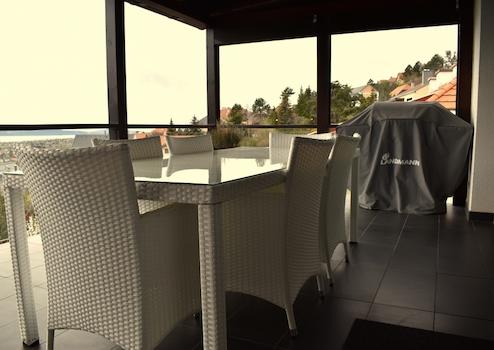 Klasszikus balatoni mediterrán megjelenésével, jól harmonizálnak a fehér falak a gesztenye színű faburkolatok. A panoráma teraszoknak köszönhetően a Balaton mellett a település is a lábunk előtt hever.
