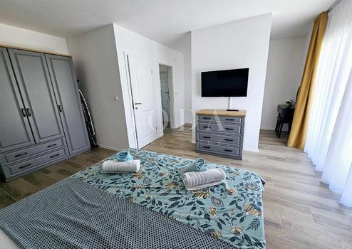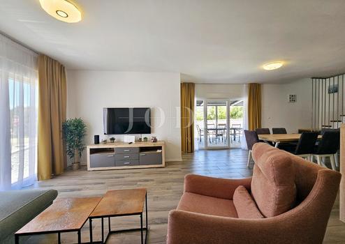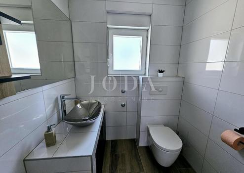 Zum Verkauf steht ein neues, modernes Doppelhaus mit beheiztem Pool in ruhiger Lage in Malinska. Das Haus erstreckt sich über drei Etagen, Keller, Erdgeschoss und Obergeschoss, und hat eine Gesamtfläche von 122,64 m2. Im Kellergeschoss befinden sich zwei Schlafzimmer, ein Badezimmer, ein Vorraum und ein Abstellraum unter der Treppe. Das Erdgeschoss besteht aus einem Wohnzimmer, einer Küche mit Esszimmer, einer Treppe und einer Toilette. Vom Wohnzimmer aus hat man Zugang zu einem wunderschön angelegten Garten, in dem sich ein Swimmingpool und eine Liegewiese befinden. Im Obergeschoss befinden sich ein Badezimmer, ein Schlafzimmer mit einem separaten Teil, der als Arbeitszimmer genutzt werden kann, und eine geräumige Terrasse. Parkplätze für zwei Fahrzeuge sind vorhanden.