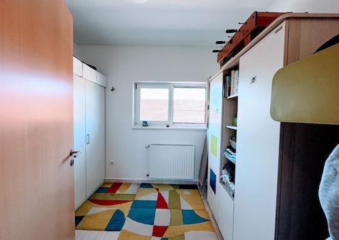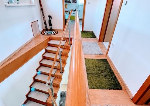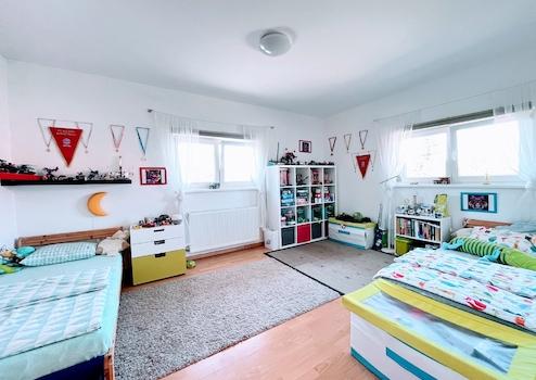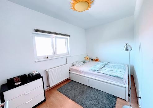 Auf der oberen, 49 qm großen Ebene befinden sich zwei weitere Zimmer, ein großer Kleiderschrank und ein Bad/WC.
