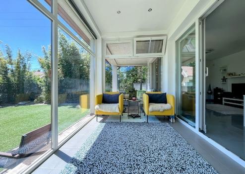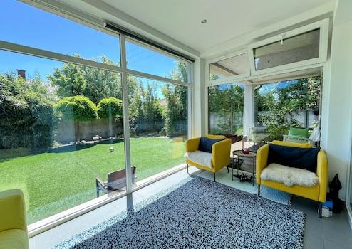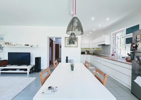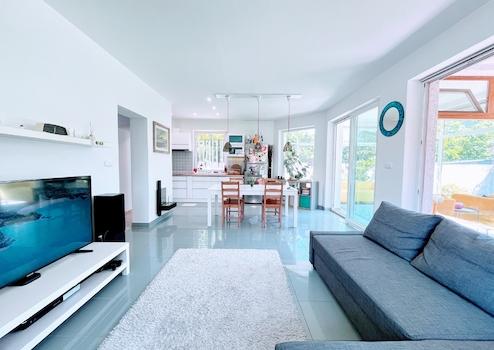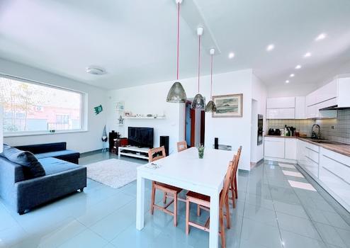 Auf der unteren 82 m² großen Ebene befinden sich ein luftiges Wohnzimmer und eine Küche/Esszimmer, ein Schlafzimmer, ein Wintergarten und eine Terrasse sowie ein Badezimmer/WC. Selbstverständlich befindet sich die Garage auf dieser Ebene, mit direktem Zugang zur Straße.