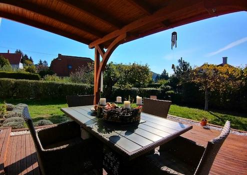 A házhoz egy szépen parkosított, diszkrét kert tartozik, és egy jól használható fedett terasz is helyett kapott a kertben.
