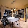 Im Erdgeschoss gibt es eine Küche mit Esszimmer und Wohnzimmer, eine Toilette und eine überdachte Aussenküche mit Grill und Tisch. Grosse Glaswände über die gesamte Länge des Wohnzimmers und Esszimmers ermöglichen einen freien Blick auf die Bucht, den Pool und die grosse Terrasse. Im Wohnzimmer gibt es einen modernen Kamin. An der Seite des Hauses gibt es einen Spielbereich.
