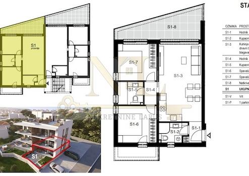 S1-Erdgeschosswohnung zum Verkauf in einem neuen Gebäude mit 6 Wohneinheiten in bester Lage in Okrug Gornji, Insel Čiovo.