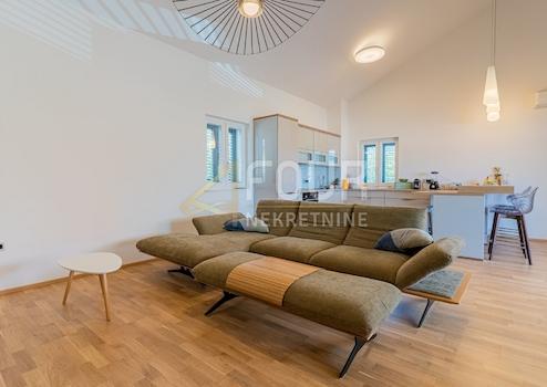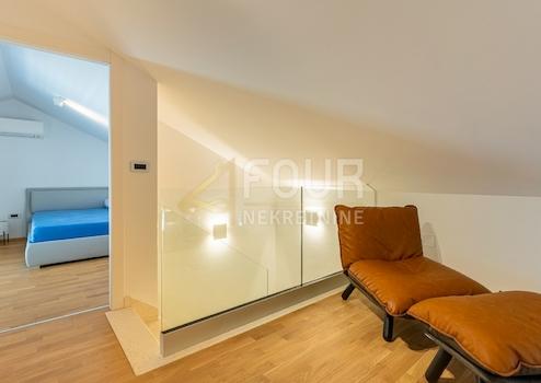 Wohnzimmer mit Küche und Esszimmer, Loggia, zwei Schlafzimmer, Badezimmer, Abstellraum, eine Treppe zum hohen Dachgeschoss, wo sich ein Galerieraum, ein Schlafzimmer, ein Badezimmer, ein Abstellraum und eine Dachterrasse befinden.