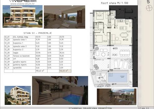 Dieses Angebot bezieht sich auf die Wohnung S1 im EG. Die geräumige Wohnung ist in zwei Bereiche unterteilt. Bei Betreten der Wohnung gelangt man in den offen gehaltenen Wohnbereich mit offener Küche, Essbereich und einen voll ausgestatteten Badezimmer. Der zweite Bereich beherbergt den Schlaftrakt mit zwei Schlafzimmern und einen weiteren Badezimmer. Durch deckenhohe Glasschiebetüren gelangen Sie sowohl aus den Wohnzimmer als auch aus einem Schlafzimmer zur zauberhaften überdachten Terrasse von knapp 54 m², die einen offenen Panoramablick auf das Meer und reichlich Platz für gesellige Zusammenkünfte mit Familie und Freunden bietet. Von der Loggia führen nur wenige Treppenstufen zum privaten Pool mit Sonnendeck, der zum Entspannen und Erholen einlädt.