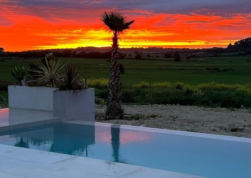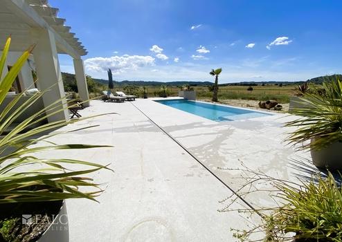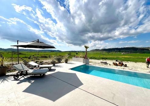 Der Außenbereich dieses Anwesens ist ebenso beeindruckend. Der freie Blick verspricht entspannte Stunden im Freien. Der private 8 x 3 m Infinity-Pool mit Wasserdepot bietet an heißen Sommertagen eine erfrischende Abkühlung. Eine weitläufige Terrasse mit integrierten Sitzgelegenheiten und ein separater Grillbereich lädt zu geselligen Abenden unter freiem Himmel ein.