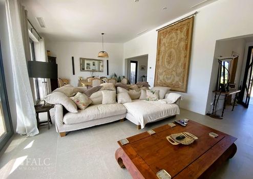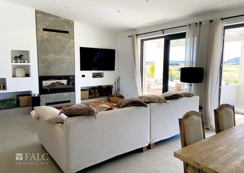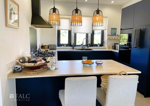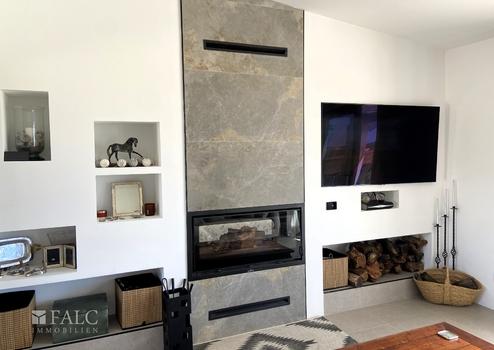 Der einladende Eingangsbereich führt in ein weitläufiges Wohnzimmer, das durch Großzügigkeit und Helligkeit überzeugt. Hier laden ein Kamin und große Fensterfronten zu behaglichen Stunden ein. Das Haus hat eine Klimaanlage (kalt oder warm), jedes Zimmer hat seinen eigenen Kompressor. Ein Holzofen heizt das Wohnzimmer und das Hauptschlafzimmer; außerdem hat er ein paar Rohre, um die Wärme mit einem automatischen Ventilator in andere Räume zu pumpen. Angrenzend befindet sich die stilvolle, voll ausgestattete Küche, die keine Wünsche offen lässt. Ein Esszimmer sorgt für familiäre und gesellige Momente.