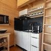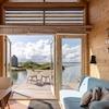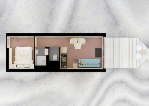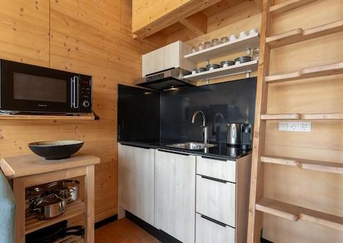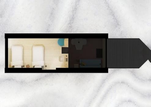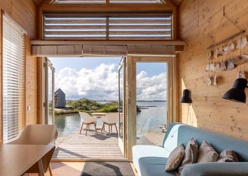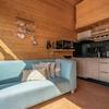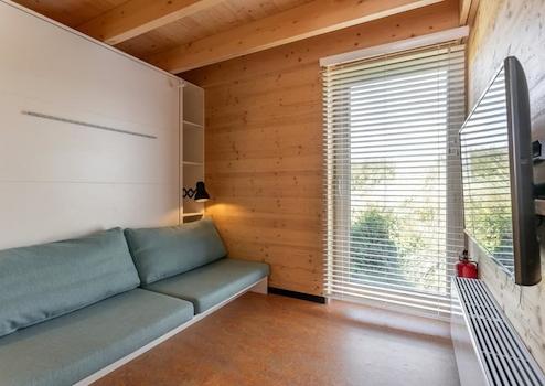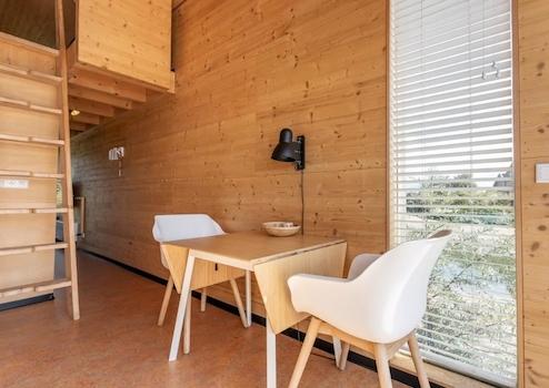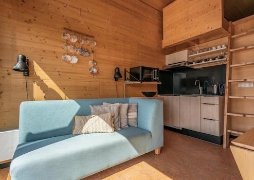 Dieses Tiny House für bis zu 4 Personen hat eine Wohnfläche von 41m2. Der Essbereich und die Sitzecke sind mit der offenen Küche kombiniert und bieten einen atemberaubenden Blick auf das Wasser. Die Tiny Houses sind dank der 14 Sonnenkollektoren und 2 Wärmekollektoren auf dem Dach autark. Der Smart-TV befindet sich im hinteren Teil des Tiny Houses in einem Raum, der möglicherweise als zusätzliches Schlafzimmer genutzt werden könnte
