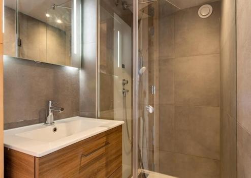 Das Badezimmer ist bemerkenswert geräumig und mit einem großzügigen Waschbecken mit 2 Schubladen und einem Spiegel ausgestattet. Die begehbare Dusche ist geräumig und leicht zugänglich. Auch das Abwasser wird in einem Tank unter der Lodge gefiltert. Dank der Zirkulationsdusche verbrauchen Sie auch weniger Wasser. Dieses Badezimmer befindet sich im Erdgeschoss.