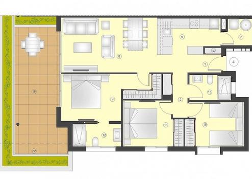 Die Wohnungen und Bungalows im Erdgeschoss verfügen über einen Garten, während die Wohnungen im Obergeschoss über eine Sonnenterrasse verfügen.