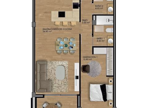 Das angebotene Apartment im OG bietet eine bebaute Wohn-Nutz-Fläche von ca. 110,8 m², davon ca. 22,8 m² Terrasse.