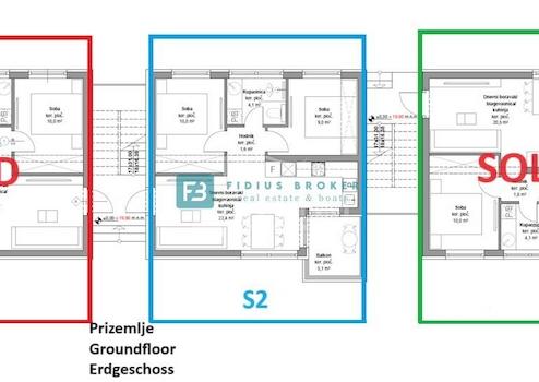 Die Wohnung S2 befindet sich im Erdgeschoss mit einer Gesamtnutzfläche von 54,70 m2 und besteht aus einem Flur, zwei Schlafzimmern, einem Badezimmer, einem Wohnzimmer mit Küche und einem Esszimmer sowie einem Ausgang zu einem Balkon von 5,1 m2 . Zur Wohnung gehört 1 Parkplatz. Der Preis beträgt 149.000 € (inkl. MwSt. – der Käufer ist von der Zahlung von 3 % Immobilienumsatzsteuer befreit).