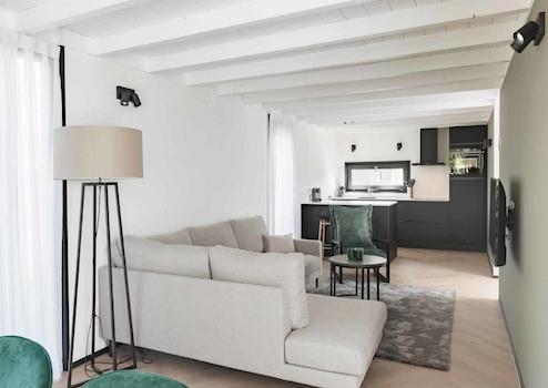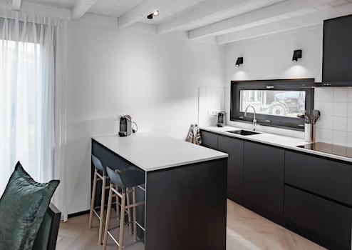 Entdecken Sie die moderne und stilvolle Küche unseres Ferienhauses in Brielle. Die mit viel Liebe zum Detail gestaltete, offene Küche bietet alle Annehmlichkeiten, die Sie während Ihres Aufenthalts benötigen. Das schlichte Design mit schwarzen Schränken und einer weißen Arbeitsplatte verleiht der Küche ein modernes Flair.