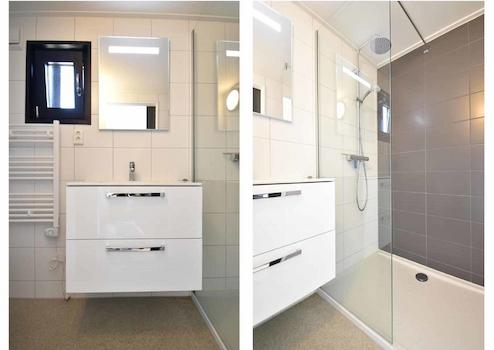 Badezimmer 1 ist ein stilvolles und modernes Badezimmer, das an Schlafzimmer 1 angeschlossen ist. Dieses Badezimmer verfügt über eine Toilette, eine geräumige, begehbare Dusche und ein Waschbecken mit einem funktionalen Schrank. Das zeitgenössische Design und die hochwertige Ausstattung sorgen dafür, dass Sie Komfort und Luxus genießen können. Bad 1 bietet alles, was Sie für einen erfrischenden Start in den Tag oder einen entspannten Abend brauchen.