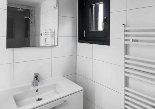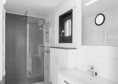 Das Badezimmer 2 befindet sich auf dem Flur und wird von den drei übrigen Schlafzimmern gemeinsam genutzt. Dieses moderne Badezimmer ist mit einer geräumigen, begehbaren Dusche, einem Waschbecken mit praktischem Schrank und einer Toilette ausgestattet. Sein zeitgemäßes Design und die hochwertige Ausstattung sorgen für ein komfortables und angenehmes Nutzungserlebnis für alle Gäste. Badezimmer 2 bietet Komfort und Luxus und eignet sich perfekt für die gemeinsame Nutzung durch mehrere Personen.