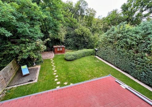 A kert minden oldalról védett a kíváncsi szemektől, de az őzike azért gyakori vendég. A kertben fatároló, szerszámos ház, nyársaló, napozó kapott még helyet.