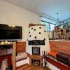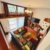 Es lohnt sich, etwas gesondert über das Wohnzimmer zu sprechen, da sein Design ungewöhnlich ist. Das Wohnzimmer liegt tiefer als die Ebene der Küche/des Esszimmers, sodass Sie sich vom Esszimmer aus an ein geschmiedetes Eisengeländer lehnen und mit den im Wohnzimmer wohnenden Familienmitgliedern sprechen können. Die dem Garten zugewandte Seite des Wohnzimmers besteht praktisch vollständig aus Glas und lässt viel Licht herein. In diesem Wohnzimmer mit enormer Deckenhöhe steht Ihnen stattdessen ein professionell gebauter Dunstabzugsofen zur Verfügung, der problemlos das ganze Haus heizen kann, ganz zu schweigen von der Atmosphäre, die er an kalten Abenden schafft.