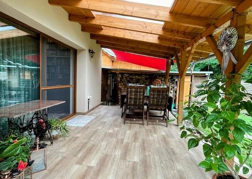 A kert felől nyílik a fedett terasz is, mely jó időben - a hatalmas, elhúzható teraszajtónak köszönhetően - gyakorlatilag a nappali része lehet. A terasz fedése részben fa, részben pedig fényt áteresztő polikarbonát.
