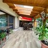 Auch die überdachte Terrasse öffnet sich zum Garten hin, der bei schönem Wetter – dank der riesigen, versenkbaren Terrassentür – praktisch zum Wohnzimmer werden kann. Die Terrasse ist teilweise mit Holz und teilweise mit lichtdurchlässigem Polycarbonat überdacht.